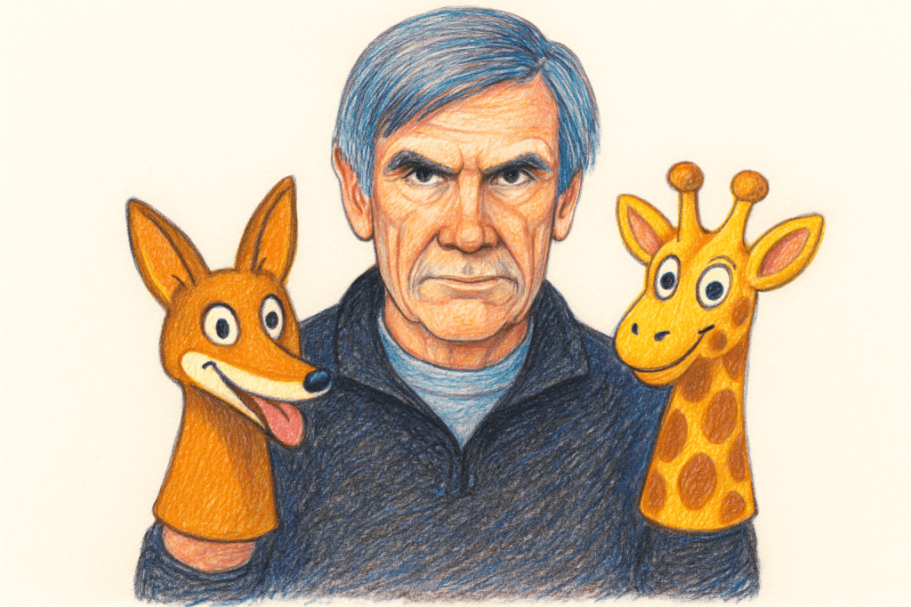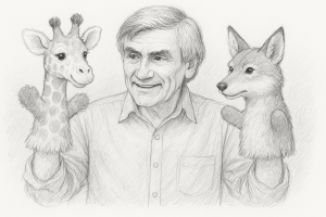 At some point a different workshop participant, who had gone to a toy store during a break, brought back a jackal puppet for Marshall — which at first seemed merely a playful joke (surely to then be re-gifted to a child) — but then, again spontaneously, Marshall opted to use it during a demonstration on how to deal with (jackal-esque) judgments and was struck by the liveliness that ensued. (As in the days of ancient theater, replete with a narrative Greek chorus, bearing witness to the ‘jackal show’ was born.)