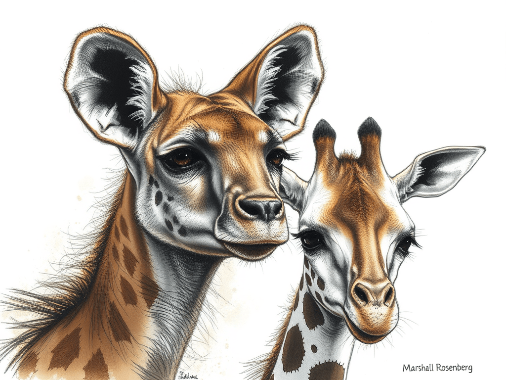 “In order to show the differences between communication styles, Rosenberg started to use two animals. Violent communication was represented by the carnivorous Jackal as a symbol of aggression and especially dominance. The herbivorous Giraffe on the other hand, represented his NVC strategy. The Giraffe was chosen as symbol for NVC as its long neck is supposed to show the clear-sighted speaker, being aware of his fellow speakers’ reactions; and because the Giraffe has a large heart, representing the compassionate side of NVC. In his courses he tended to use these animals in order to make the differences in communication clearer to the audience.”